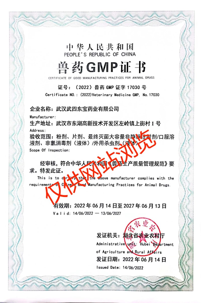 武漢武四東寶藥業(yè)有限公司,是在原武昌獸藥廠(成立于1972年)基礎(chǔ)上發(fā)展而來,公司位于武漢市東湖新技術(shù)開發(fā)區(qū)左嶺工業(yè)園,是一家專業(yè)從事動物保健品的研發(fā)、生產(chǎn)、銷售和服務(wù)于一體的高新技術(shù)企業(yè),目前擁有六條生產(chǎn)線、十種劑型(最終滅菌小容量注射劑、最終滅菌大容量非靜脈注射劑、口服溶液劑、粉劑、預(yù)混劑、固體殺蟲劑、液體殺蟲劑、片劑、顆粒劑、液體消毒劑)。公司成立于2004年,2006年全面通過國家農(nóng)業(yè)部獸藥GMP認證,已成為中國獸用保健行業(yè)知名企業(yè)之一。武漢武四東寶藥業(yè)有限公司自創(chuàng)建以來,一直秉承著“善、行、學(xué)、成”的核心價值觀,恪守“一切為了健康養(yǎng)殖”的企業(yè)使命,堅持“科技成就價值,服務(wù)創(chuàng)造未來”的服務(wù)理念,經(jīng)過多年不斷的創(chuàng)新與發(fā)展,逐步形成了自己的核心競爭力,并在行業(yè)中脫穎而出。公司與中國農(nóng)業(yè)大學(xué)、華中農(nóng)業(yè)大學(xué)、武漢工程大學(xué)、武漢工業(yè)學(xué)院、中科院水生所等全國知名院校和科研院所建立了長期密切的合作關(guān)系,通過聯(lián)合攻關(guān)和技術(shù)引進等方式,研發(fā)出50多種優(yōu)質(zhì)、高效、穩(wěn)定的產(chǎn)品,并深得廣大用戶的認可與信賴。公司以“追求健康的用戶群體和卓越市場占有率”為經(jīng)營理念,堅持以市場為導(dǎo)向,強化科技創(chuàng)新,拓展產(chǎn)品結(jié)構(gòu),努力為我國健康養(yǎng)殖事業(yè)的發(fā)展作出更大的貢獻!